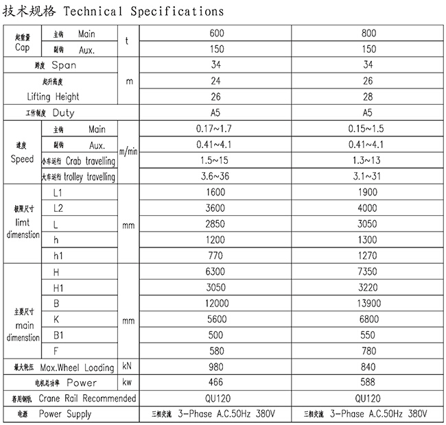 QD型600、150~800、150t吊钩桥式起重机